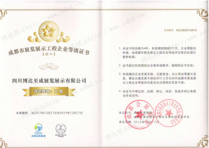 在全公司同事的通力合作下,公司历经三个月专家严密的初审,复审,及现场审核后,确定公司符合申请的各项条件。于2015年12月17日向公司颁布了“成都展览展示工程企业二级资质”。
