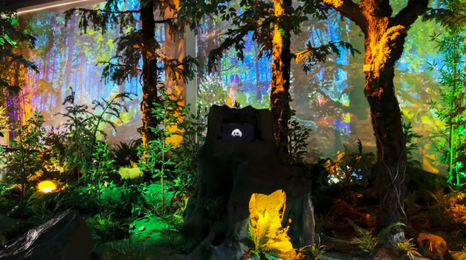 博达至成设计师在瓦屋山大熊猫国家公园博物馆中搭建出一处绿色的光影生境,将珙桐、高山杜鹃等瓦屋山代表植物都“搬”到展馆中,与呼吸灯、动态投影一同形成取之于自然、更超越自然的绿色光影空间。参观者步入其中,能够自然地感到放松和愉悦,在精心布置的灯光效果中感受丛林探秘的乐趣。