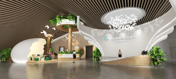在博达至成建设的四川老君山自然保护区宣教馆中,你可以在每一处细节中找到这样的撞色搭配。设计师充分利用原有的建筑结构,将大厅立柱处理为原木色的树干,结合白色的蛋壳、飞鸟,点缀绿色植物,打造出清新自然的生态空间。白色和棕色作为两种性质不同的中性色,能够从两种角度一同中和绿色带来的鲜亮感,构成更丰富完整的绿色展示空间。